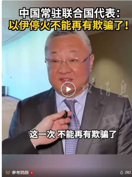 当地时间6月24日,中国常驻联合国代表傅聪在出席联合国安理会相关会议前被记者问及对当前以伊停火的看法。他表示:“我们希望这次停火能够维持住,并且能够被各方忠实遵守。这一次,不能再有欺骗了。”