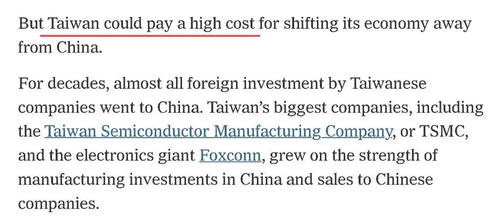 当地时间 7 月 7 日,美国《纽约时报》刊登了一篇关于台湾能否与大陆在经济上脱钩的文章……