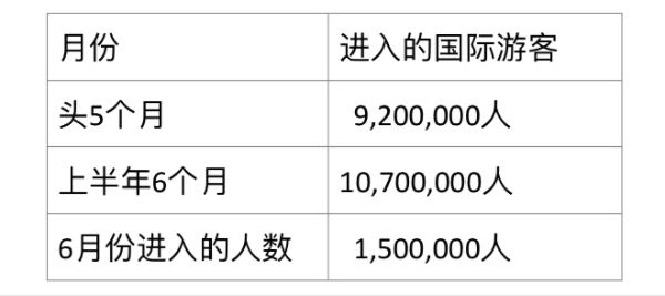 在6月份这一个月内进入的国际游客人数就有150万人,与2024年6月相比,增加17%.