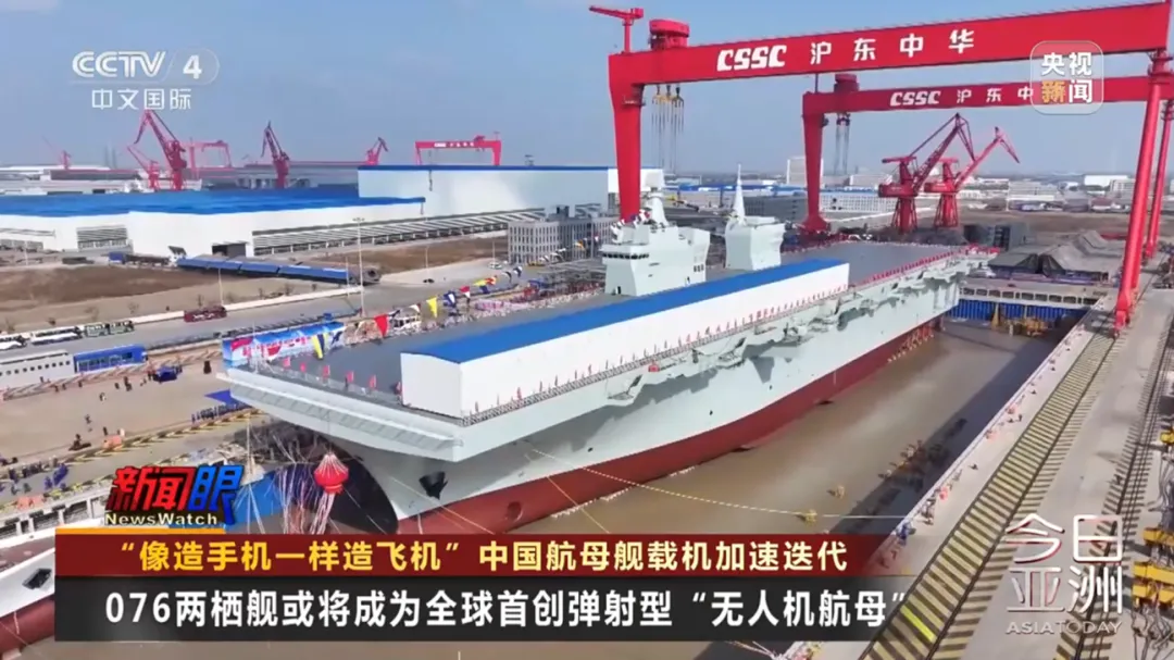 2024年12月,中国海军新一代两栖攻击舰076首舰四川舰下水。四川舰满载排水量4万余吨,创新应用了电磁弹射和阻拦技术。军事专家指出,如果攻击型、侦察型的无人机能够在076两栖舰上通过电磁弹射的方式升空,那么今后四川舰就会变身全球首艘弹射型“无人机航母”,可以说是“独步全球”。