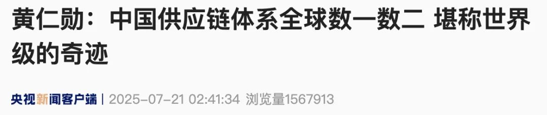 黄仁勋:中国运营着全球数一数二的供应链体系,它的规模、复杂性、多样性,制造商的产品类型、技术含量,参与建设中国供应链的企业数量,都堪称世界级的奇迹。
