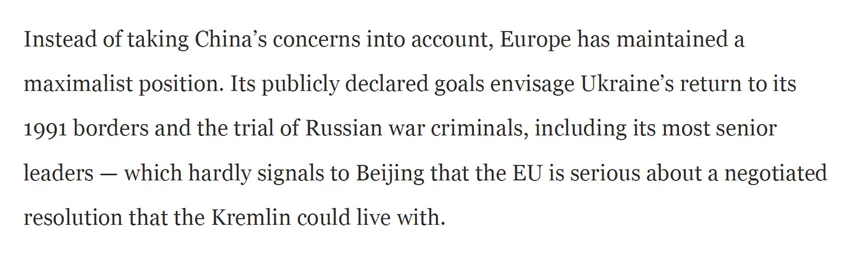 在文章第一段,加布耶夫给冯德莱恩泼了一盆冷水。他表示,尽管冯德莱恩想让北京远离莫斯科,以迫使俄罗斯更认真地与乌克兰谈判,但对北京施压的这种做法在过去三年都没有改变其立场,如今也很可能不会奏效。