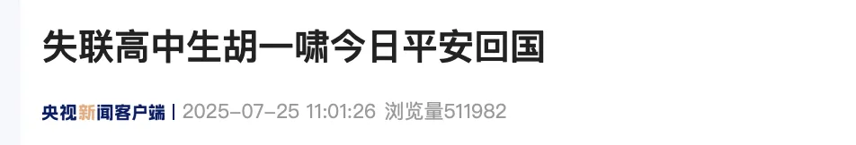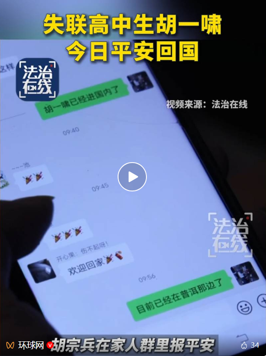 总台记者获悉,今天上午,安徽庐江失联高中生胡一啸已经从云南普洱的勐啊口岸平安入境回国。
