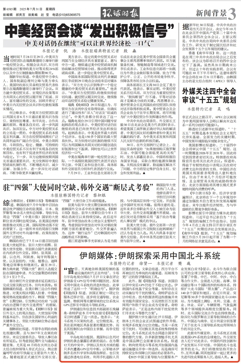 “盲目、天真地依赖美国控制的基础设施的时代正在终结”,卡塔尔半岛电视台网站7月27日文章在评论伊朗备受GPS信号中断问题困扰、探索采用中国北斗系统的消息时指出,此举传递了这样一个“明确信号”。据伊朗《同胞报》报道,该国正制定一项定位服务迁移计划,逐步将交通导航、农业监测、物联网等关键领域的定位系统从GPS迁移至中国北斗导航系统。