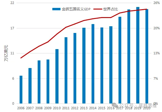 金砖国家名义GDP及占世界比例 世界银行、人大重阳(制图)