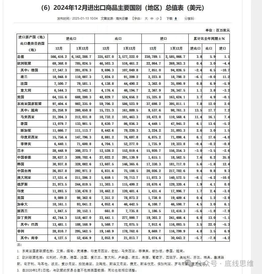2024年中国对各个主要贸易伙伴的进出口贸易总值 海关总署网站