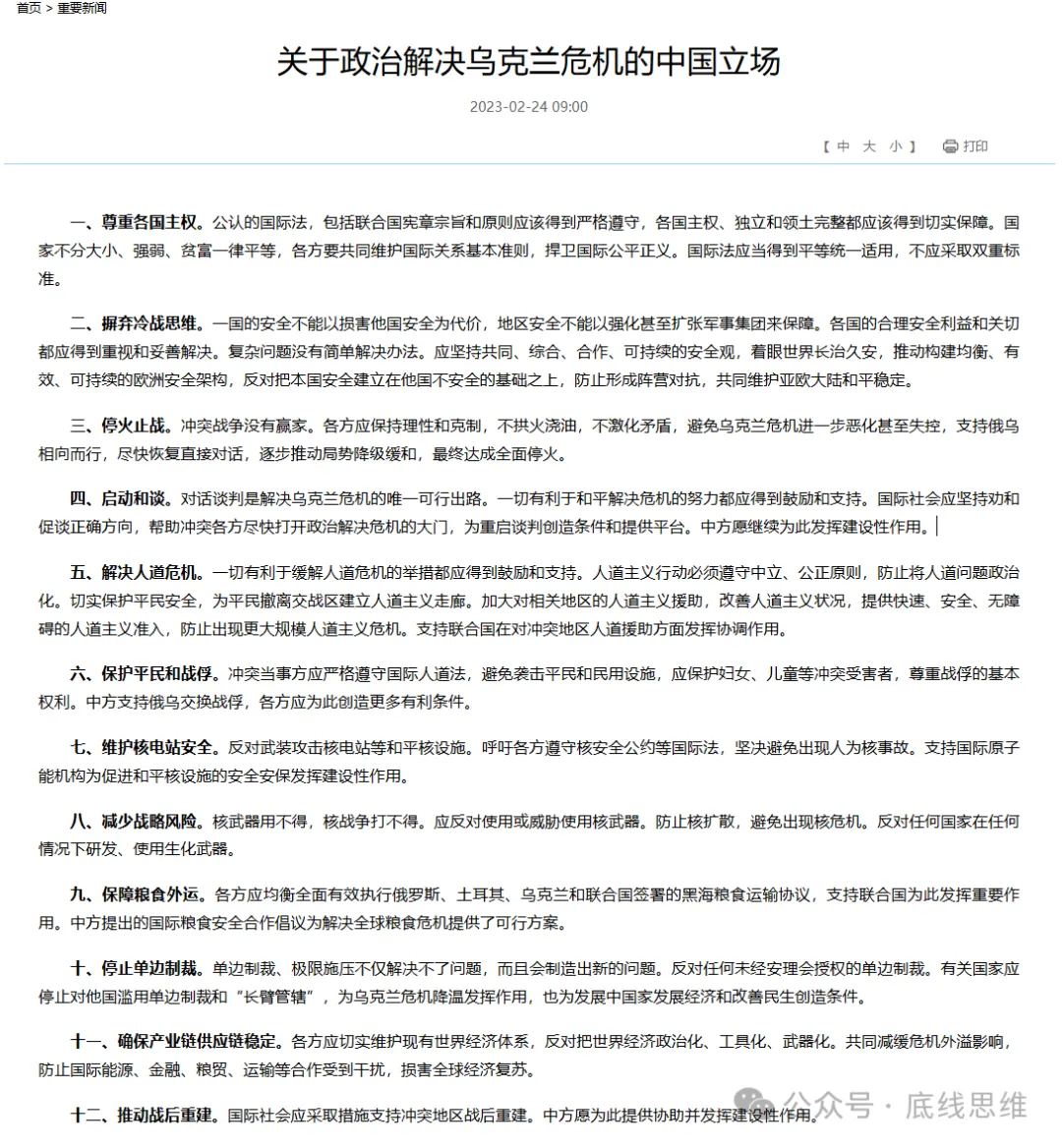 2023年2月24日,中方发布关于政治解决乌克兰危机的12点立场声明 外交部网站