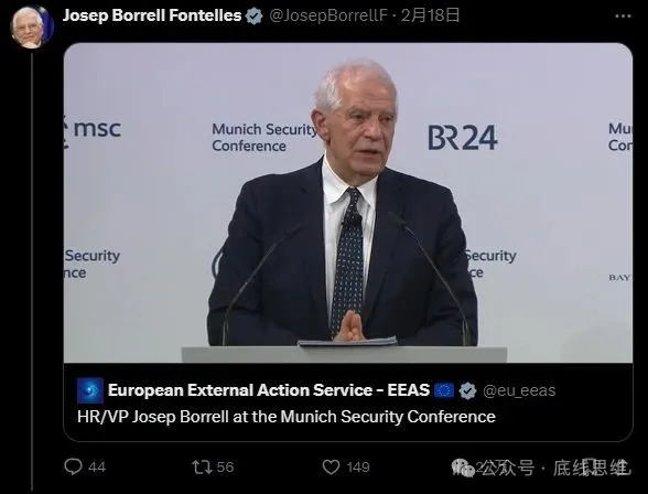 时任欧盟安全与外交政策负责人博雷利2024年2月在慕尼黑安全会议上表示,俄乌冲突和巴以冲突,“极大地加深”了全球南方国家与欧盟之间的政治隔阂