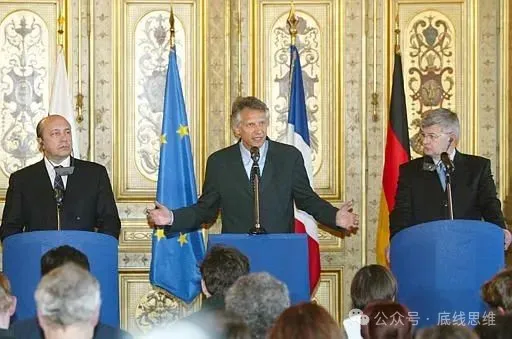 2003年3月,时任法国外长德维尔潘(中)、俄罗斯外长伊万诺夫(左)、德国外长费舍尔(右)在巴黎召开联合记者会,反对联合国安理会通过对伊拉克动武的决议 资料图