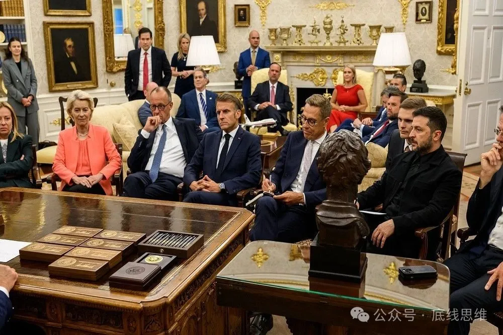 当地时间18日,特朗普在白宫与乌克兰总统泽连斯基和其他欧洲领导人会面 图自:白宫社交媒体账号