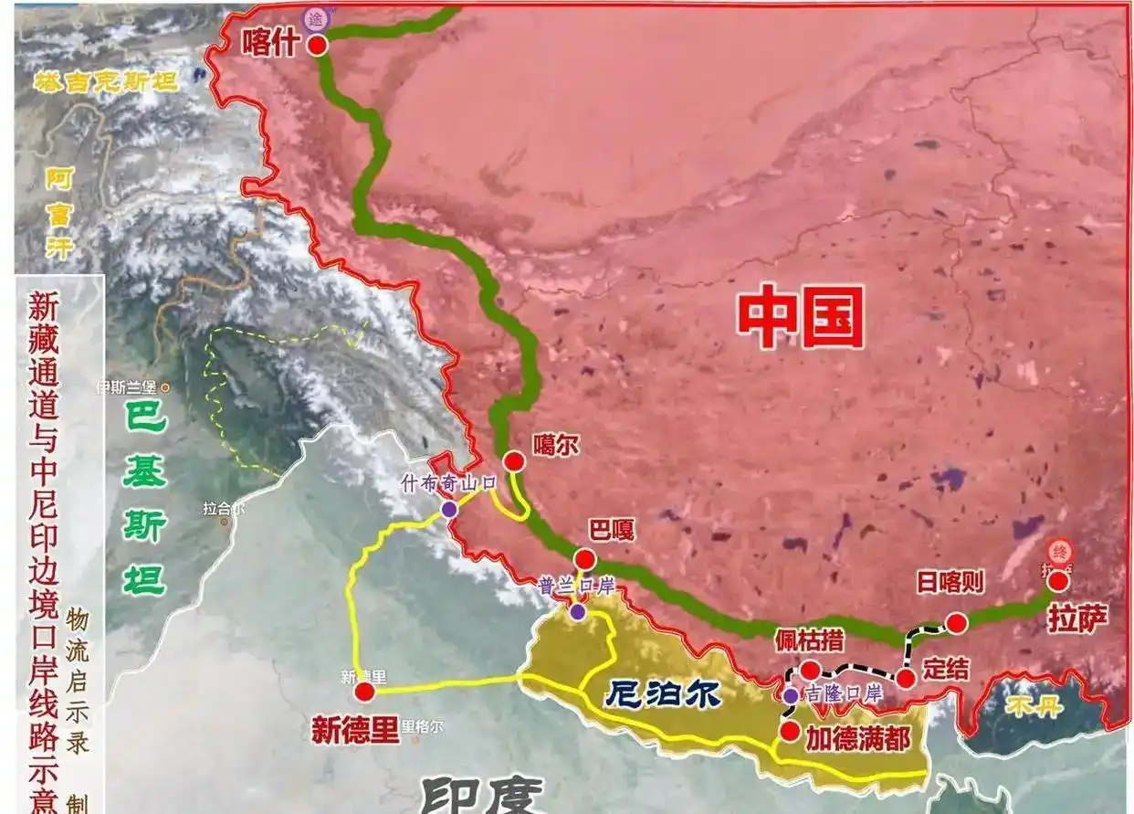新藏铁路沿着西藏西部边界要走,准备在狮泉河、巴嘎、定日、日喀则这些地方设12个站点,还有个值得关注的,就是会建两个边境口岸:普兰和吉隆。