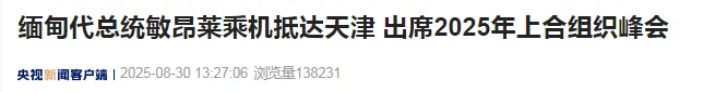 缅甸代总统敏昂莱乘机抵达天津,出席2025年上合组织峰会8月30日下午,缅甸代总统敏昂莱乘机抵达天津,出席将于8月31日至9月1日在天津举行的2025年上海合作组织峰会……