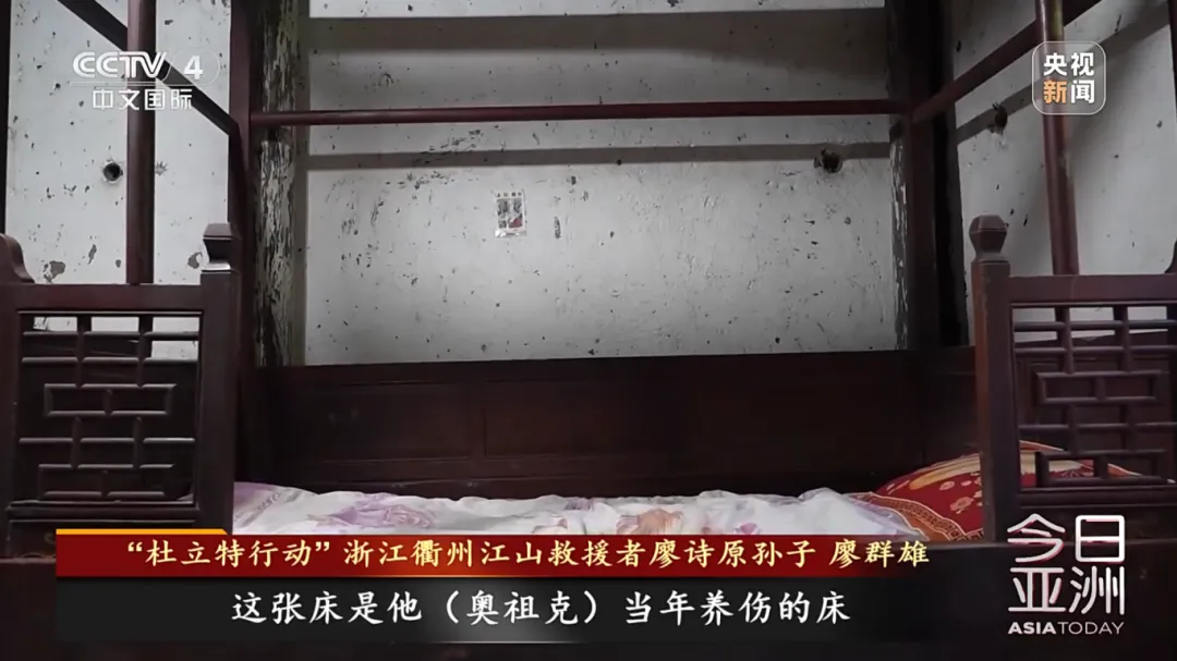 这张床是奥祖克当年养伤的床。他左腿上大概有一尺长左右(的伤口),有可能是跳伞挂在树枝上、悬崖上的时候刮伤的。我爷爷用山上挖的草药帮他伤口消肿。