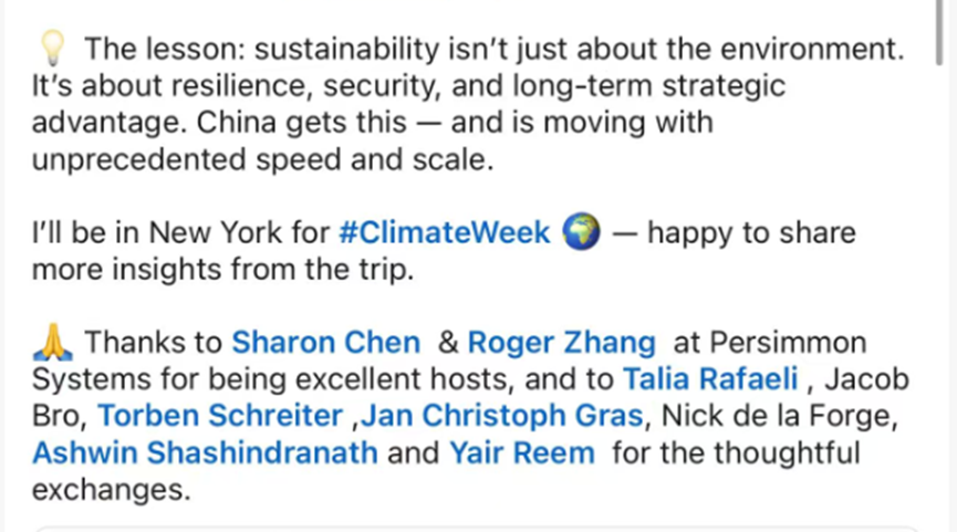 除彭博社的报道外,8名投资人中也有人在自己的社交账号上发帖分享了这趟中国之行的感受,其内容同样丰富。