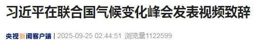 9月24日,国家主席习近平在联合国气候变化峰会发表视频致辞。
