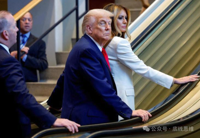9月23日,美国总统特朗普和夫人梅拉尼娅到达联合国总部参加第80届联大会议,乘坐自动扶梯时,电梯突然停止运作。 图源:路透社