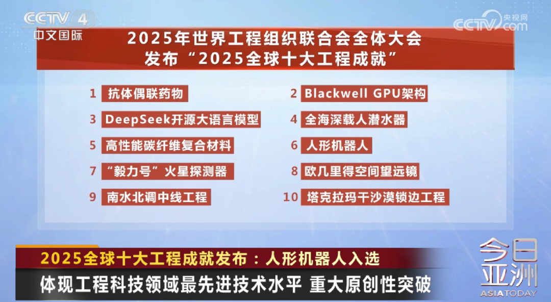 在2025年世界工程组织联合会全体大会开幕式上,正式揭晓“2025全球十大工程成就”,从DeepSeek开源大语言模型到人形机器人,来自中国的工程科技成果为应对全球性挑战发挥着关键作用。