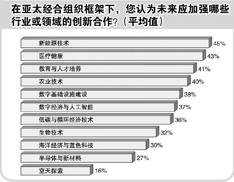 关于未来在APEC框架下的各项合作,在贸易投资领域,受访者最期待降低关税和促进贸易投资的便利化。在数字经济领域,网络安全与通信技术合作更受青睐。在创新合作方面,新能源技术最受期待,其次为医疗健康、教育人才培养及农业技术,而数字基建、数字经济与人工智能、低碳与循环经济技术的获选比例也都超过1/3。在可持续发展方面,清洁能源及低碳技术、应对气候变化的有关合作最受期待,生物多样性保护、循环经济和海洋生态保护也受到相对更高的期待。