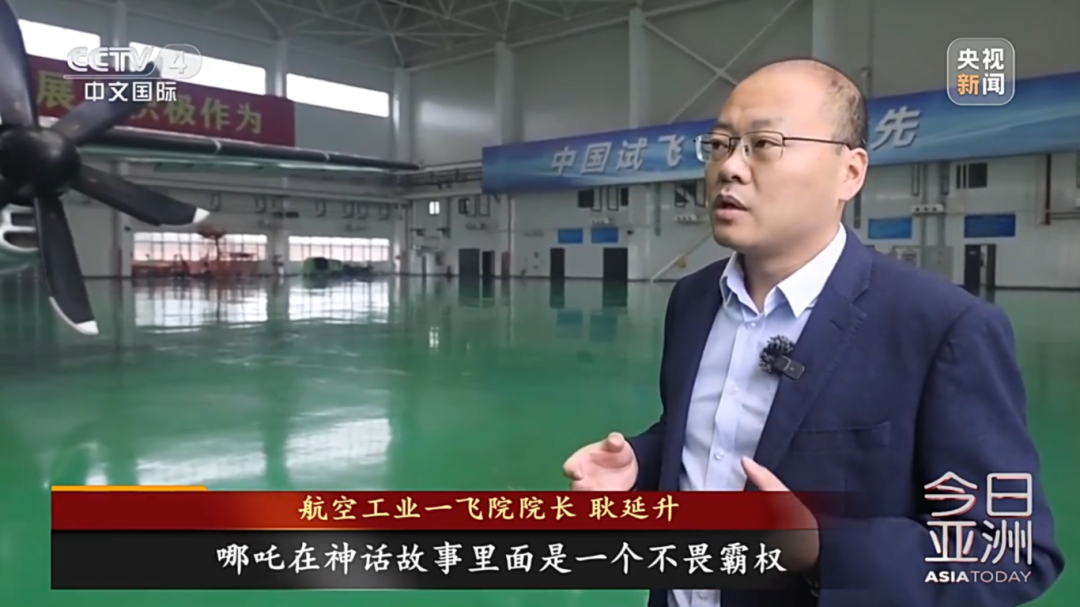 两台发动机和起落架的短舱连在一起,加上机头,看着好像是三个头的这么一个形象;因为机翼可以折叠,折叠之后加上4个垂尾,就像哪吒的6只手臂;圆形的天线罩就像哪吒手里拿的那一只乾坤圈;我们在机身上画了一个红色的标识圈,像是哪吒身上的那一条混天绫;但是更形象的特征是螺旋桨高速旋转的时候,就像哪吒脚踏的一对风火轮。哪吒在神话故事里面,是一个不畏霸权、不畏强权、为正义敢于斗争的形象,所以我们也想它以后在战场上面体现出这么一种气质。
