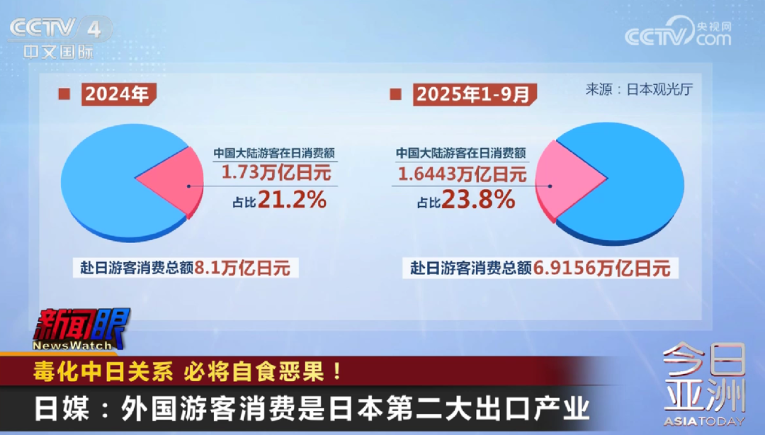日本观光厅数据显示,2024年,中国大陆游客在日消费额达1.73万亿日元,占赴日游客消费总额的21.2%。今年1至9月,这一比例进一步上升至23.8%。日媒特别指出,日本在进行国内生产总值GDP统计时,外国游客访日消费被计入“服务贸易出口”。从规模来看,外国游客消费是日本第二大出口产业,仅次于汽车整车,高于电子产品和半导体设备。