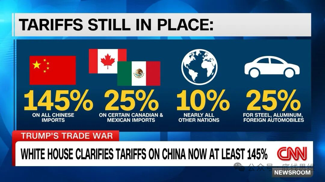 其他所有国家都有90天的缓冲期,而对中国,特朗普直接把对等关税从一开始宣布的34%提升到84%,加上之前20%关税总共104%。接着,咱们商务部就宣布也会反制到84%。接着,他又把对等税率加到125%(总税率达到145%),我们马上也反制到125%,并宣布不再理会美方的关税数字游戏。因为双方税一超过50%,大多数贸易肯定难以保持利润,所以我们说这数字游戏很无聊,不搞了,我就125%。