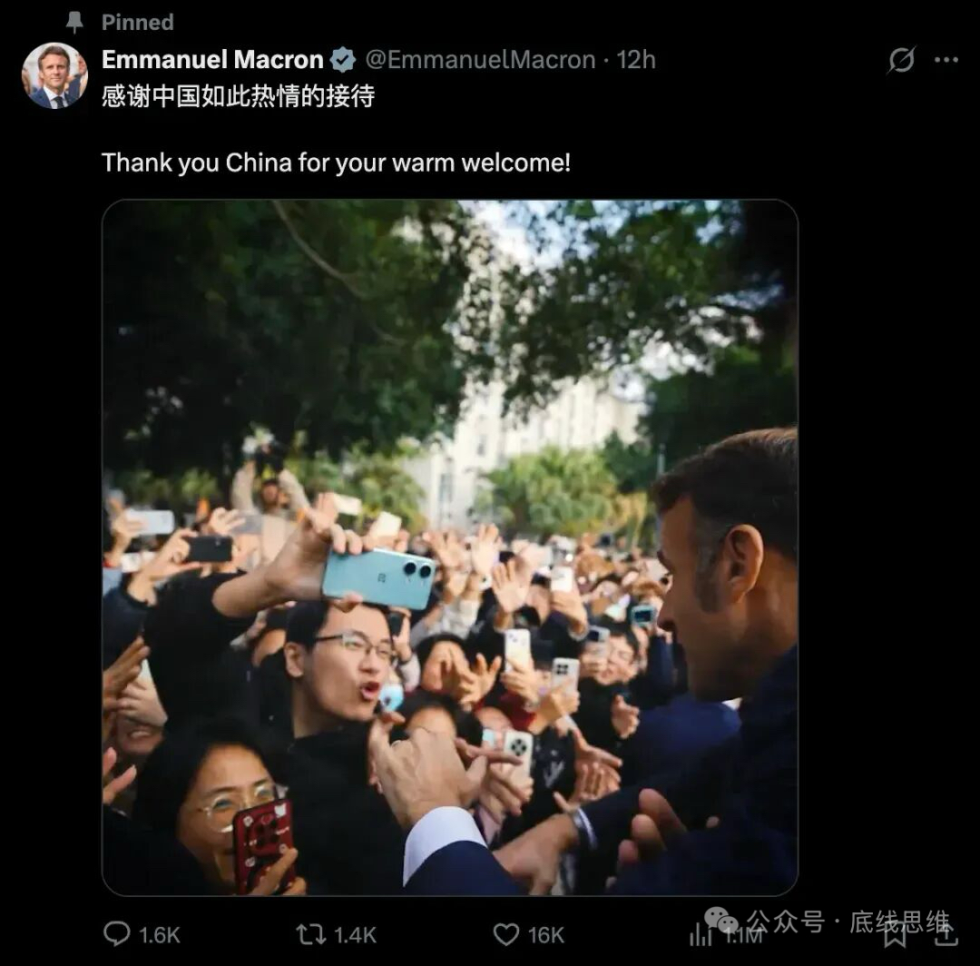 12月6日,马克龙在社交媒体上发布了此次访华的集锦视频,并用中文表示:感谢中国如此热情的接待。