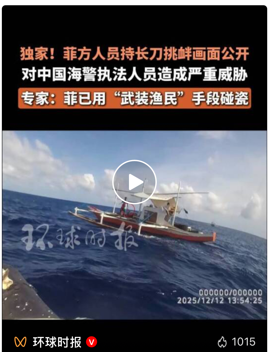 在12月15日举行的外交部例行记者会上,发言人郭嘉昆在回应外媒问询时透露,12月12日菲律宾有组织有预谋地纠集大量船只在仙宾礁附近海域挑衅滋事,并冲闯仙宾礁潟湖,此次行动中菲方人员甚至持刀威胁中方现场维权执法的海警。《环球时报》记者于15日获取的独家影像显示,面对中国海警的执法人员的管控和取证,菲方人员竟拿出长刀进行挑衅。相关专家12月16日在接受《环球时报》记者采访时表示,在此次的侵权挑衅行动中,菲方人员所展现出的组织性、对抗性,以及与菲海警船只的高度协同性表明菲方人员绝非普通渔民,而是菲军方秘密组织的“武装渔民”。“此次侵权挑衅活动表明菲方开始采用‘武装渔民’方式打头阵,目的是升级碰瓷手法,加强对华污名化叙事。”