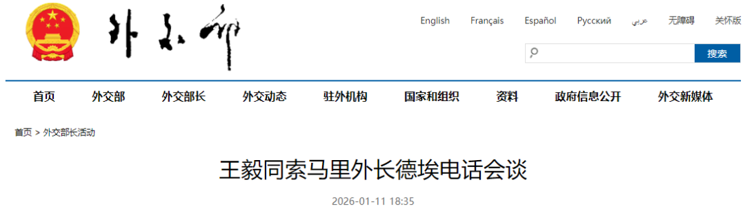 当地时间2026年1月11日,中共中央政治局委员、外交部长王毅在访问非洲途中,同索马里外长德埃举行电话会谈。