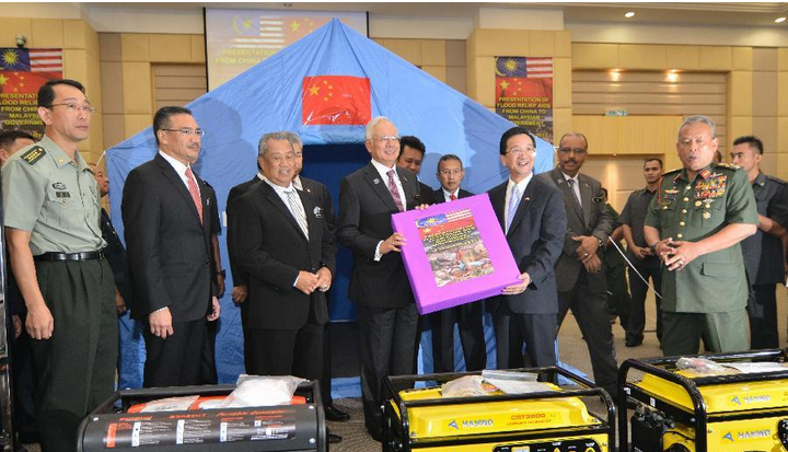1月13日,在马来西亚吉隆坡,马来西亚总理纳吉布(中)与中国驻马来西亚大使黄惠康(前排右二)出席援助物资交接仪式。当日,马来西亚总理纳吉布在吉隆坡举行的发布会上表示,中国对马来西亚抗击水灾的援助是两国友好关系的证明,他对中方的友好举动表示感谢。当天早些时候,中国援助马来西亚抗击水灾物资的交接仪式在吉隆坡举行,中方此次共向马方捐赠450顶帐篷、400个水泵、220台发电机和60台净水设备。